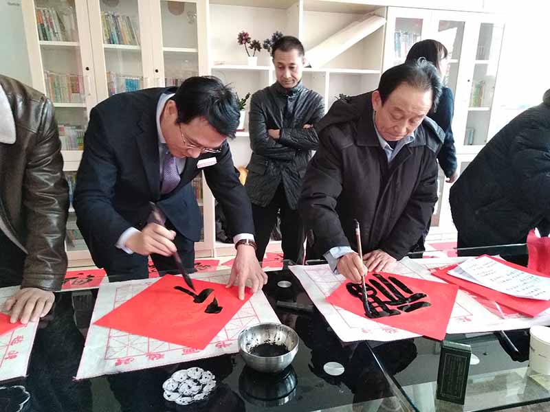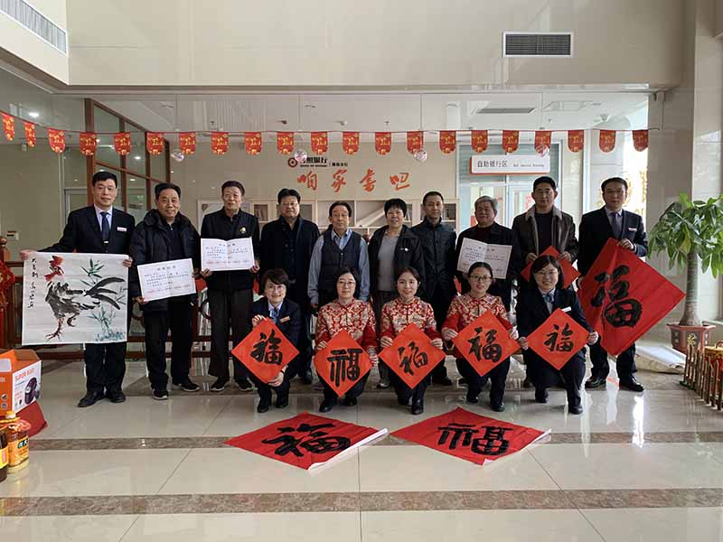 潍硬书协讯:2019年1月28日上午,腊月二十三,是传统小年。今天天朗气清,惠风和畅,潍坊市硬笔书法家协会组织书画家走进日照银行潍坊分行进行迎猪年新春联谊笔会,参加联谊笔会的潍硬书协书画家有高华忠,齐玉华,张永兰,梁玉国,张景元,高明贵,高曰君,王宝亮,赵青,马春海。参加联谊笔会的还有潍坊学院美术学院院长周晓光和日照银行潍坊分行行长王志刚、副行长时培金、总经理庄绪伟以及日照银行部分员工。在日照银行一楼大厅,喜气盈盈,书画家们精心创作了书画作品《大吉大利》、《富贵长春》和书写大量福字和春联,受到了银行员工和客户的喜爱。这也是潍硬书协走基层、送书画进社区、进企业、进学校连续七年举办此活动。