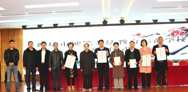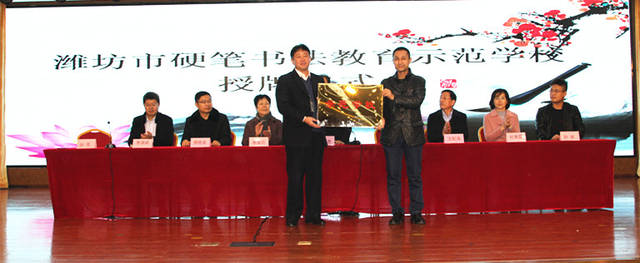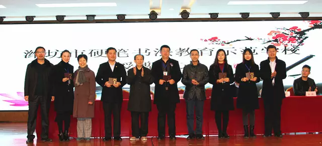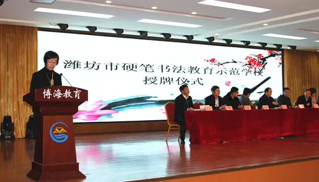 最是书香能致远,腹有诗书气自华。沐浴着冬日暖阳,2019年11月21日,“潍坊市硬笔书法教育示范校”授牌仪式在潍坊博海学校隆重举行。潍坊市硬笔书法家协会党支部书记、名誉主席高华忠,潍坊市硬笔书法家协会党支部副书记、主席齐玉华,潍坊市硬笔书法家协会党支部副书记、名誉副主席张永兰,潍坊市硬笔书法家协会监事长李洪斌,潍坊市硬笔书法家协会会员孙斌,寒亭区教体局教研室党支部书记邢世友,寒亭区教研室副主任纪素霞,潍坊接轨教育集团董事长、潍坊博海学校理事长王松海,博海学校孙校长及师生200余人参加,并召开了座谈会。