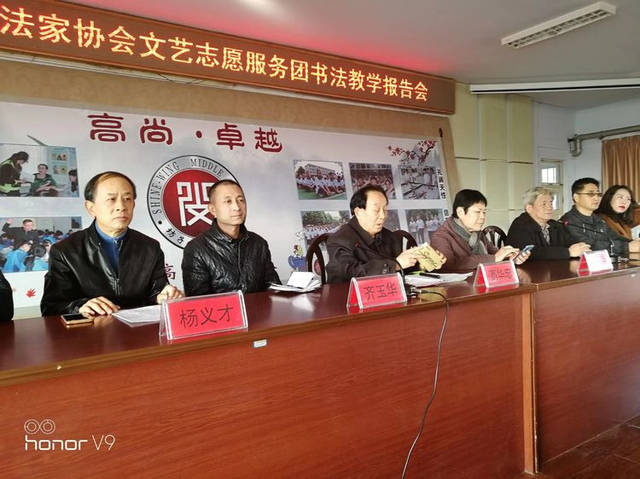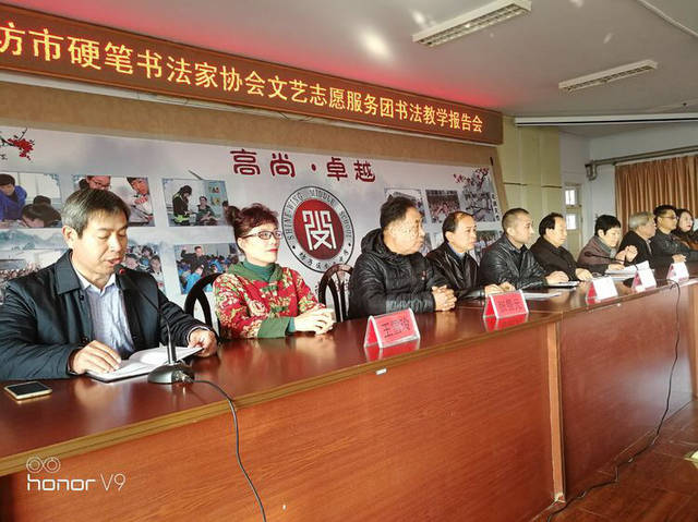 11月29日,潍坊市硬笔书法家协会文艺志愿服务团高华忠、齐玉华、张永兰、张景元、高明贵、杨义才、王宝亮、王雪玲、王爱云一行9人,在高华忠书记、齐玉华主席的带领下,来到坊子区尚文中学举办了硬笔书法报告会,区教育局李熙东主任全程陪同,尚文中学杜增东校长主持了本次会议。
