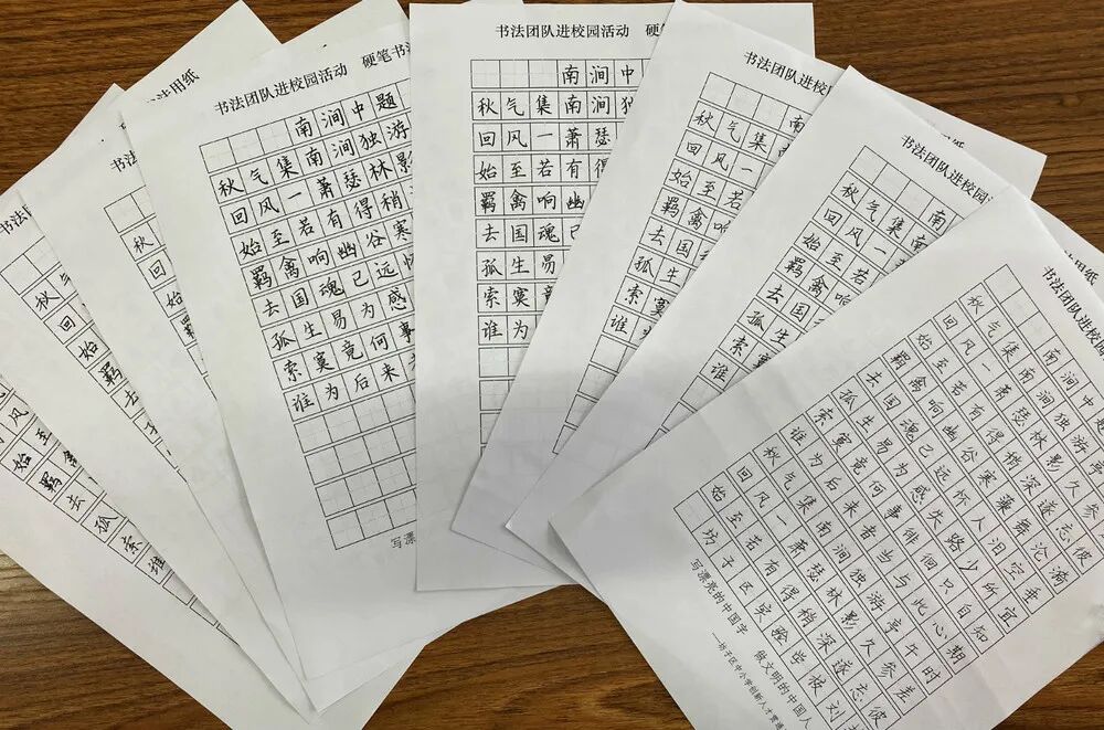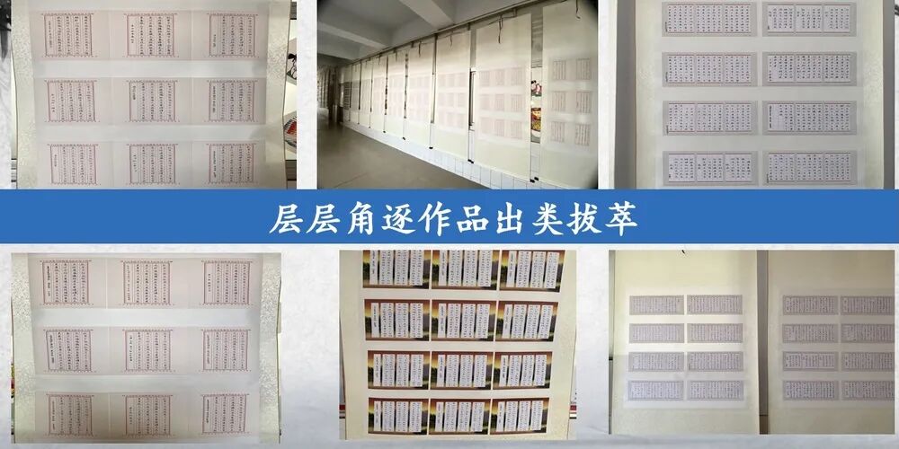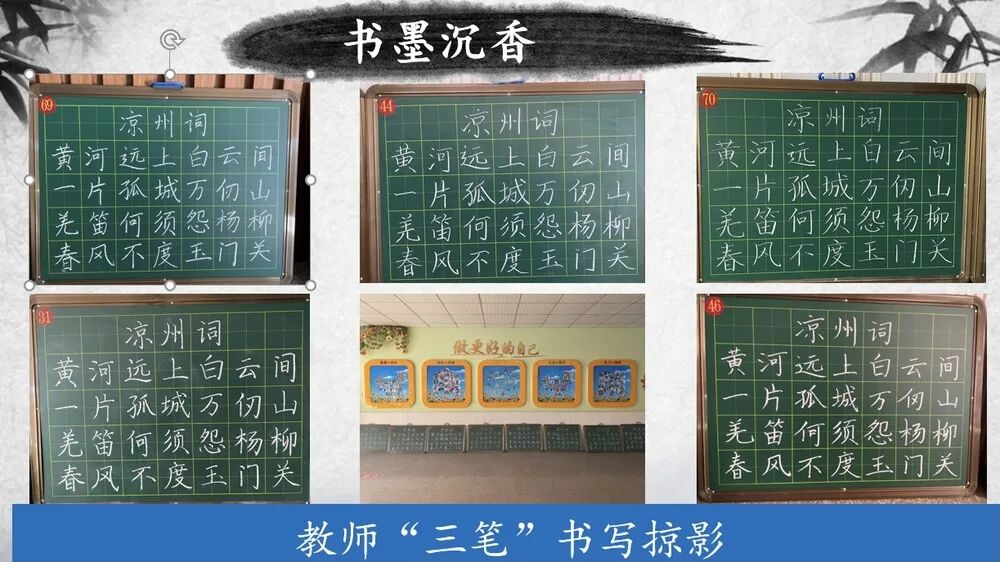 定期开展全校性即席挥毫硬笔书法比赛,每学年的上学期举行一次全校的庆元旦即席挥毫比赛,下学期举行庆六一即席挥毫比赛,并对书法作品进行评奖;除此之外,学校利用橱窗栏、走廊、等多种形式展示师生优秀作品,每周星期一教师展示一幅硬笔书法作品和粉笔书法作品,每月周一学校首层的橱窗栏展示各班优秀的学生书法作品。以此调动广大师生的书法爱好和热情,并作为学校办学的特色做好、抓好。